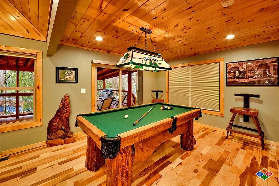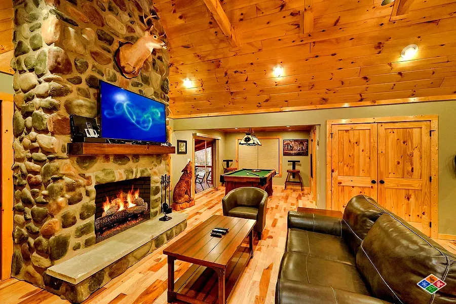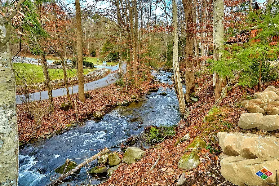 Enjoy relaxing Creekside on your covered deck with wood burning fireplace! The perfect romantic getaway Creekside - this brand new cabin features a theater room, pool table, hot tub and luxury upgrades through out. Located on Webb Creek, visitors have been known to catch trout in the this active creek. Enjoy relaxing on your private covered deck and listening to the sounds of the creek. Escape to the theater room and watch your favorite movie on the 9 foot theater screen with projector. Many upgrades in this special cabin! Free WIFI.