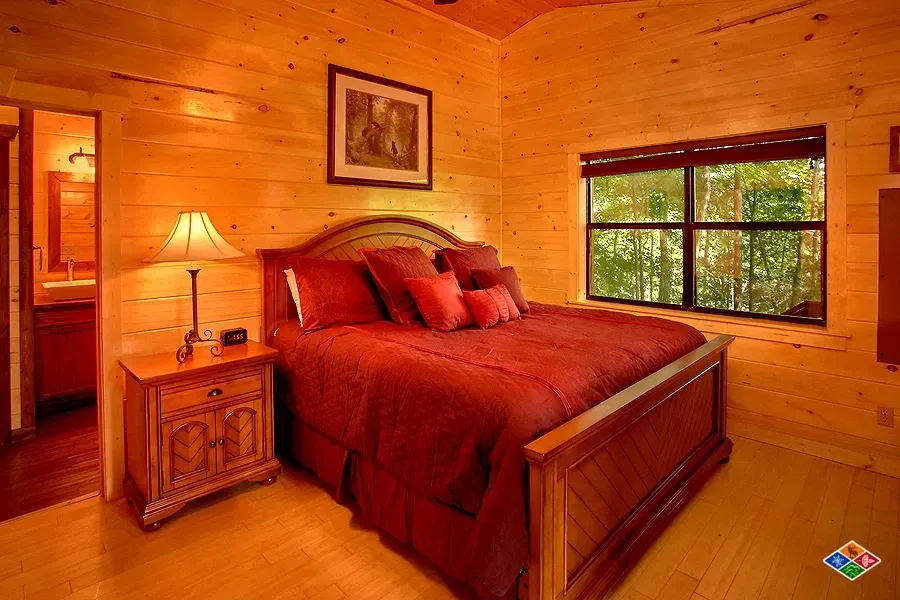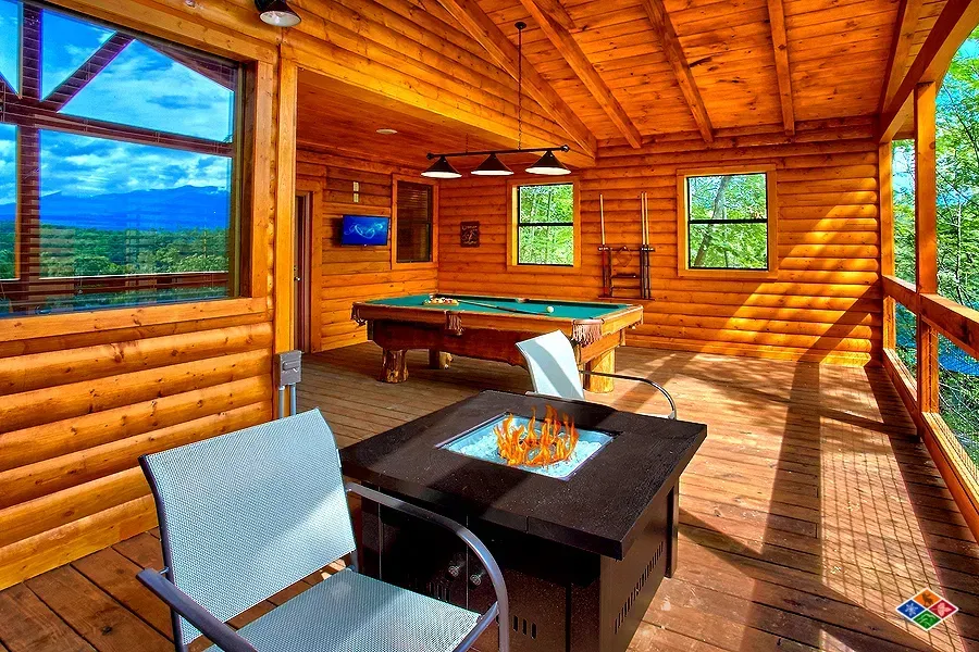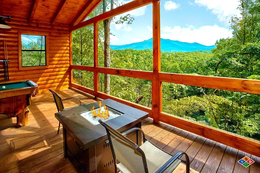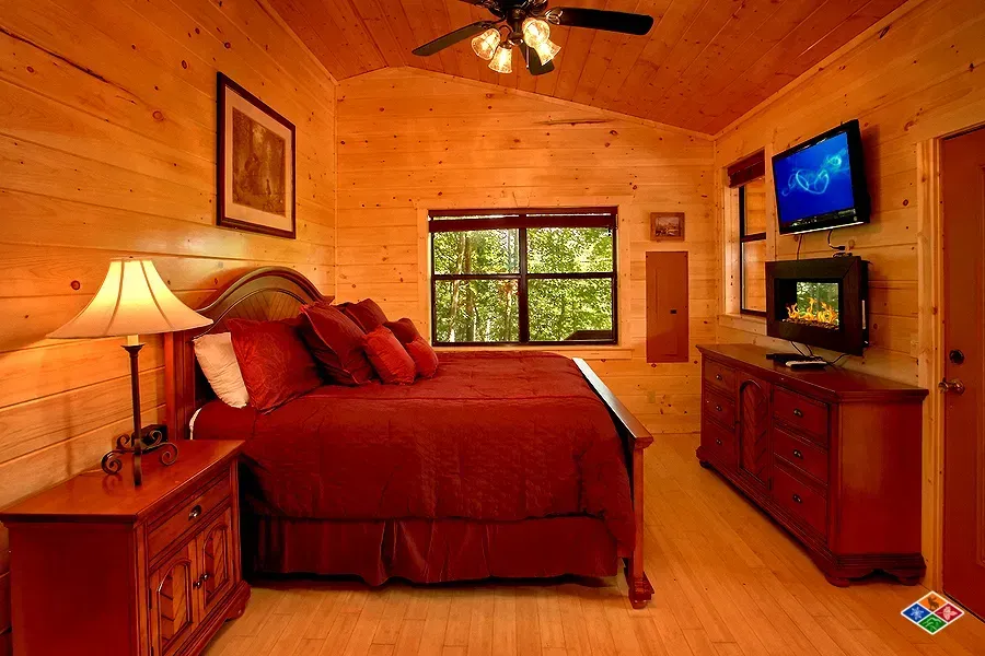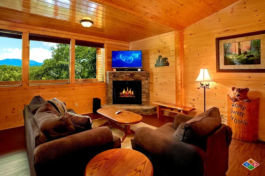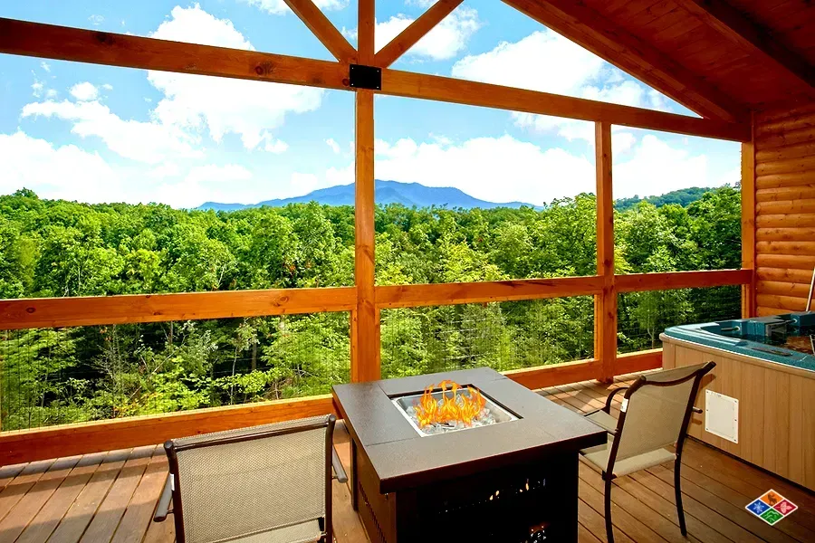 Enjoy incredible views with that someone special at Love Me Tender. Relax in the outdoor living room while enjoying the views and staying warm next to the outdoor fire pit. Relax in the 101 degree hot tub after a long day of hiking. Prepare in cabin meals in the fully equipped kitchen, enjoy free WIFI and then relax in your great room. Retire to your King Suite with fireplace and, yes, more views! Treat yourself to a rain shower and massage jets in the Suite shower.